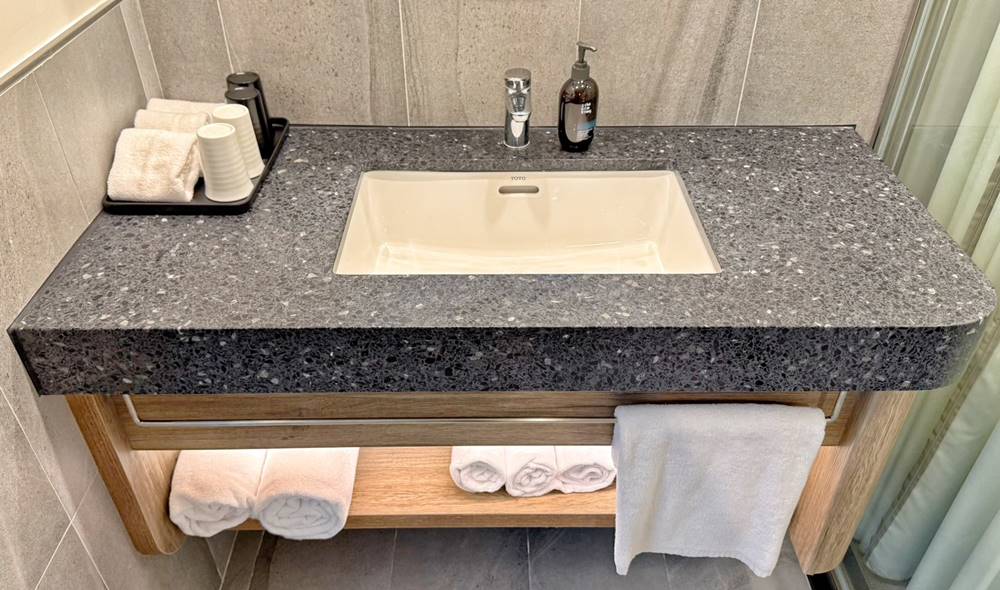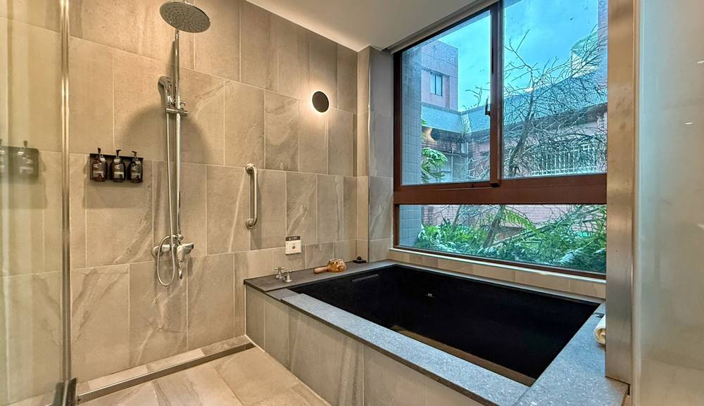 衛浴設計採乾濕分離,設計偌大的溫泉泡湯池,像我們一家子擠在一起泡都沒問題,也設置了免治馬桶,基本的盥洗用品都有提供,如吹風機、毛巾、浴巾等,但一次性的備品就不再提供囉!