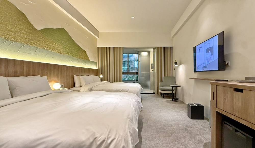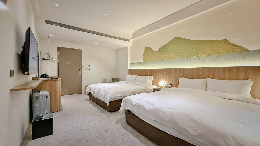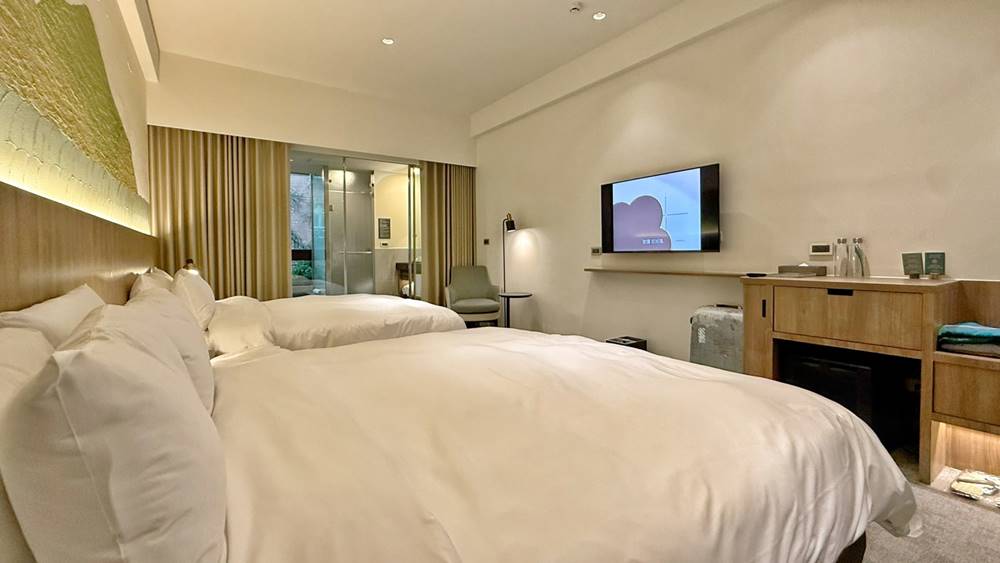 舒境家庭房的房間坪數大約10坪,提供了兩張軟硬適中的雙人床(180*200公分),同時也放有兩個不同軟硬定的睡枕及羽絨被,整體的躺臥都還算舒適。