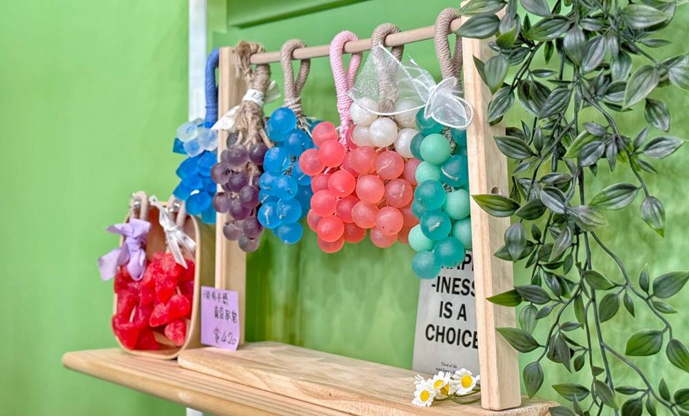 果丘in手作白木耳吸凍飲專賣店的裝潢設計不論戶外、一樓、還是二樓都很文青網美風!再訪果丘in,有發現商品及一樓的擺設有些許的變動。少了霜淇淋多了手工牛軋餅以及手工肥皂,這些很美的水果造型肥皂都是店家自己手工研製,日後還有機會新增到他們的DIY體驗課程中喔!