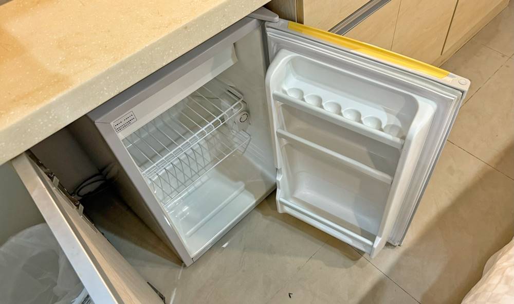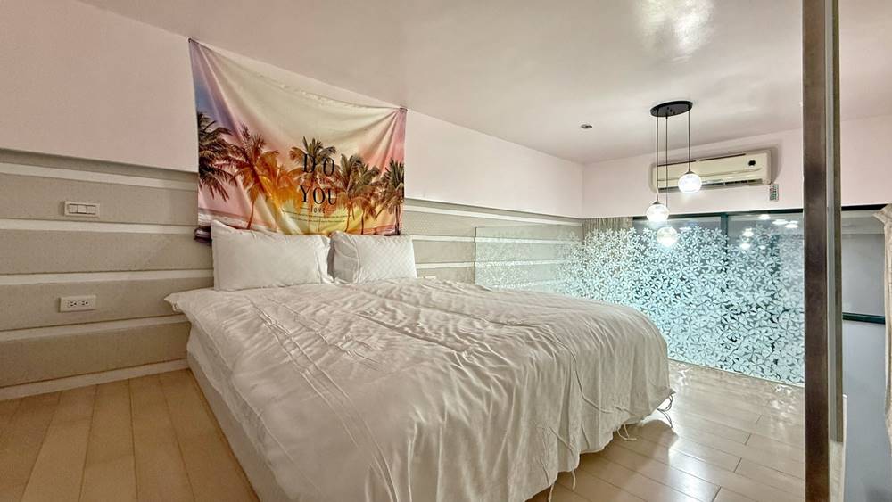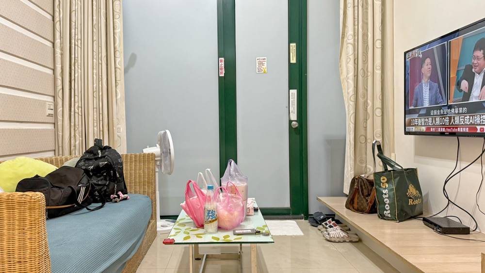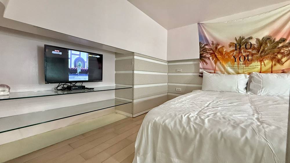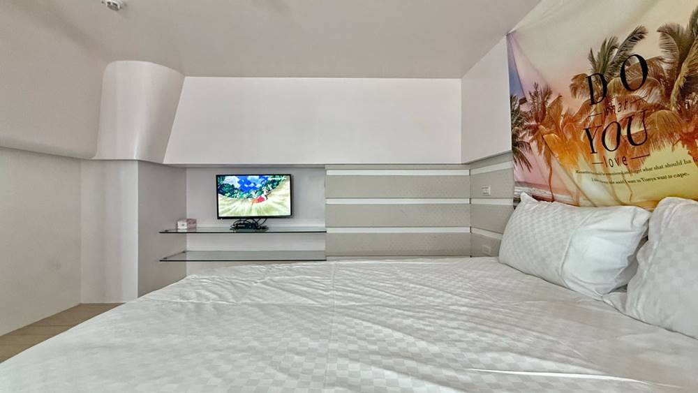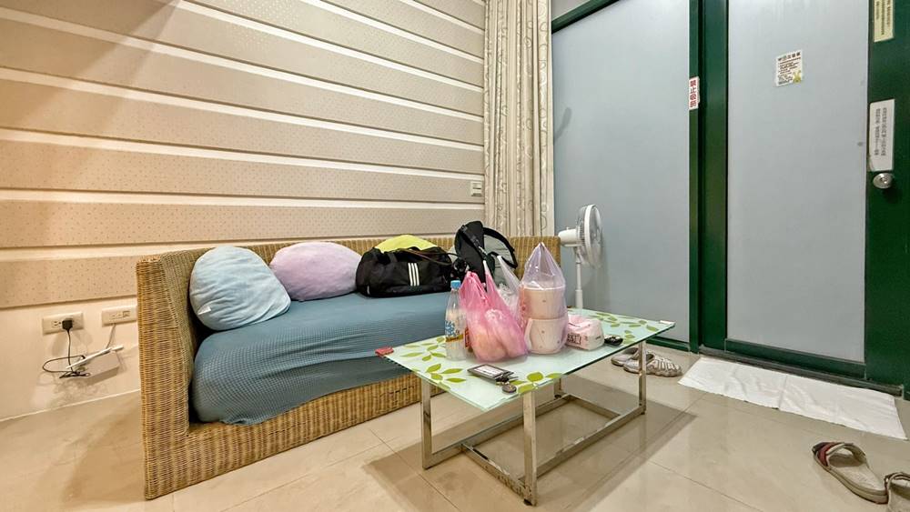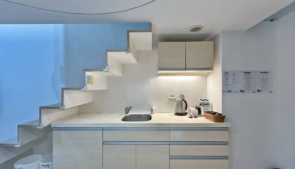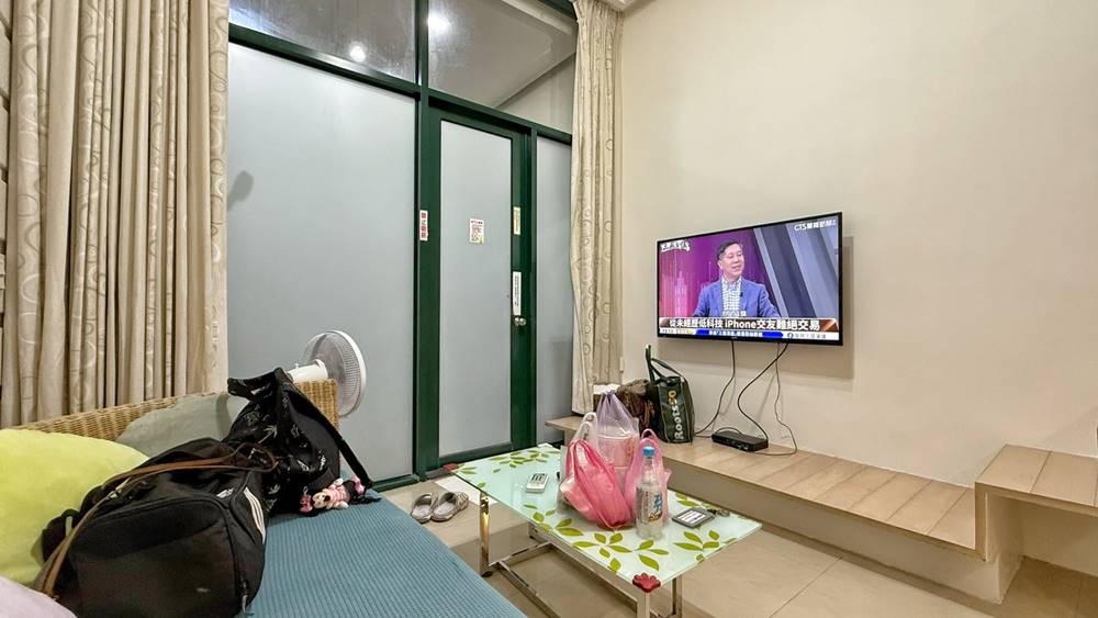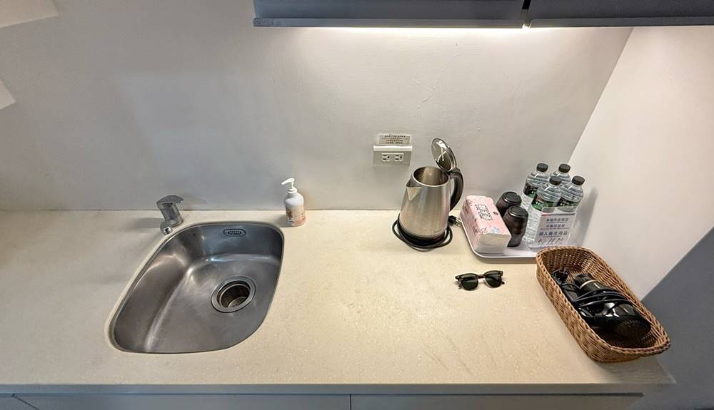打開房間,就直接看到一張床,旁邊則是一個小客廳。床的正對面算是流理台的概念,有水龍頭、快煮壺、礦泉水等。而二樓的空間則是一張床及電視。