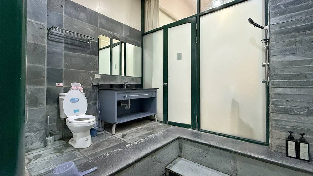 衛浴設計不是乾濕分離,主要就是有超大的溫泉池可以泡澡,這溫泉池基本上容下4個人是完全沒問題!而基本的盥洗用品也都有提供,如洗髮精、沐浴乳、吹風機、浴巾等都是有提供,至於一次性的備品就不再提供(像是牙刷(膏)、梳子、浴帽、刮鬍刀等備品)。