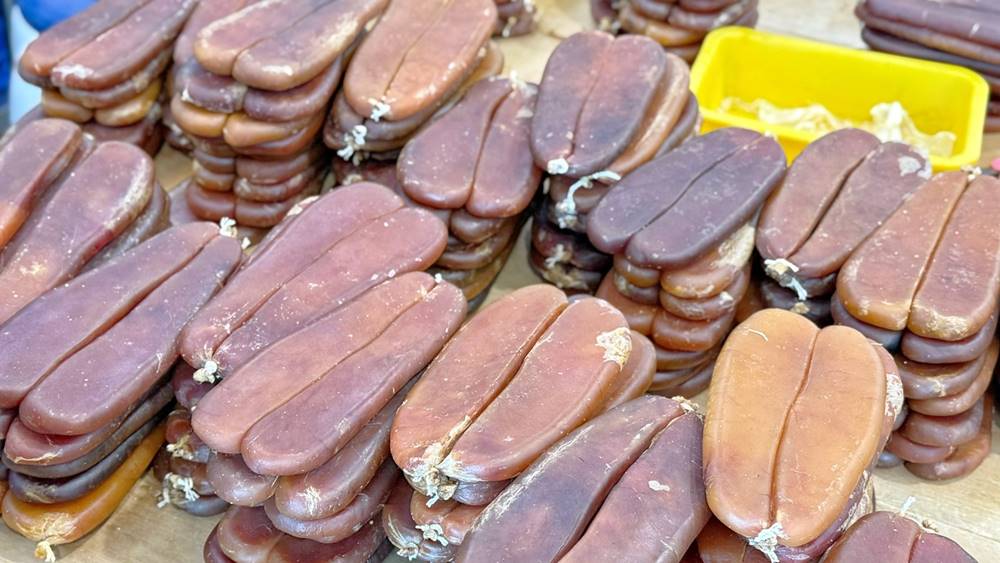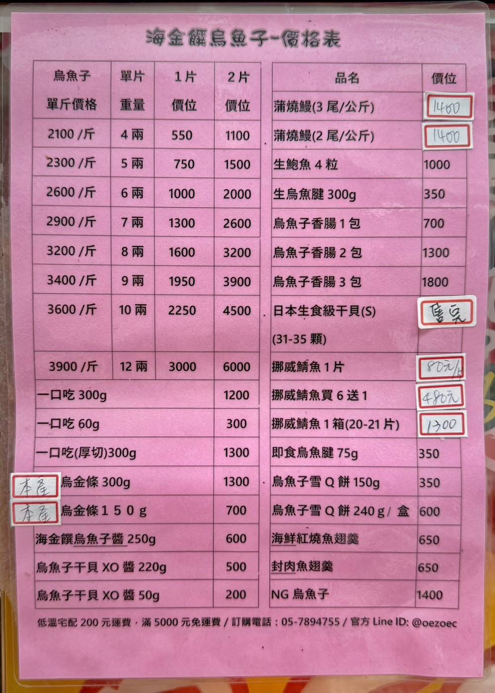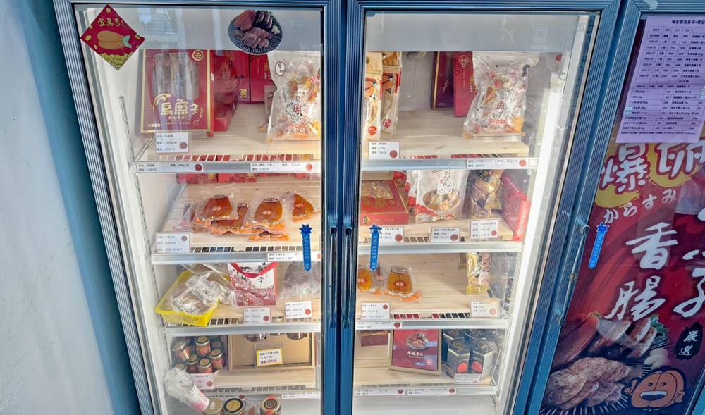 來到口湖鄉吃喝玩樂,千萬不要忘了買烏魚子回家品嘗,畢竟口湖鄉烏魚養殖產量是全台第一,而我們選擇來到海金饌烏魚子(海中寶食品有限公司),本想欣賞”曬烏魚子”的壯觀畫面,可惜夏天來訪是烏魚子的淡季,因為烏魚子主要產季在冬季,約落在每年的10月底至隔年農曆春節前,所以這次來訪無法能欣賞到曬烏魚子的樣貌,但還是能買到烏魚子相關的伴手禮喔!海金饌烏魚子的產品種類真的很多樣,訂價也標示得很清楚,這天我們就買了一口烏魚子以及烏魚子雪Q餅。