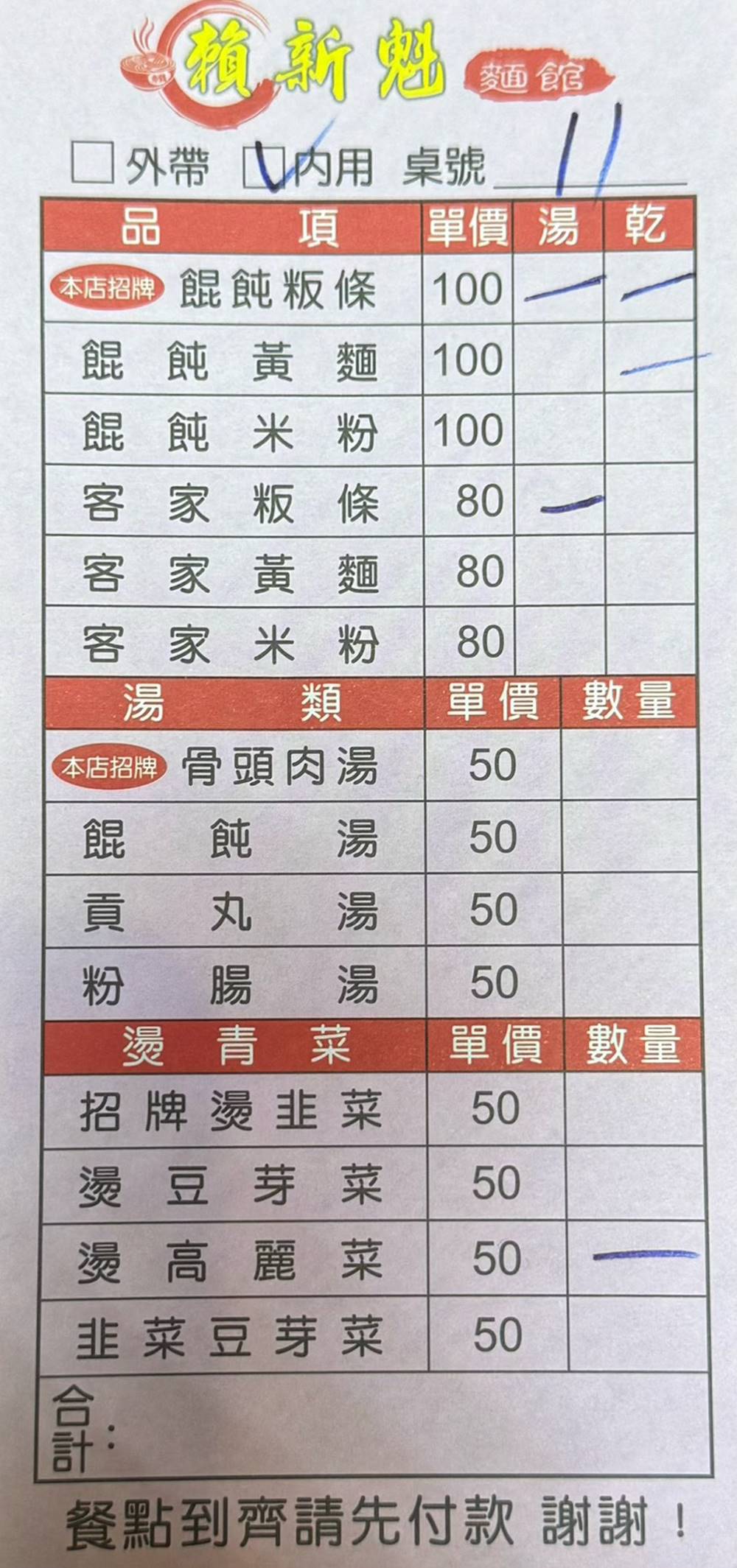 賴新魁麵館的餐點選擇有麵類、湯品、燙青菜以及各式小菜等。他們基本上都是餐後付款喔!