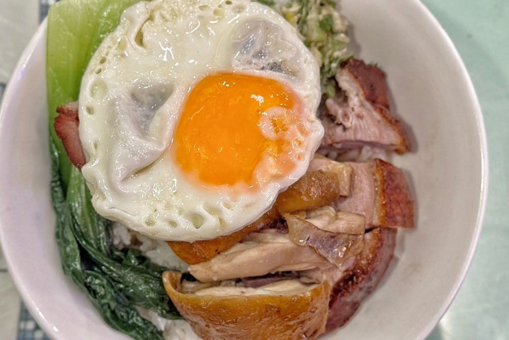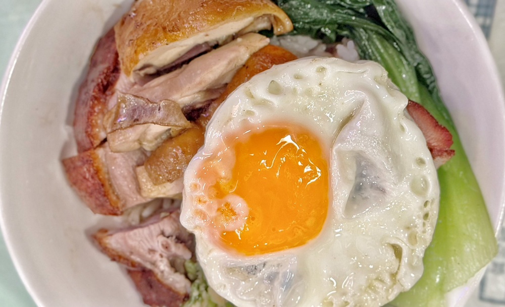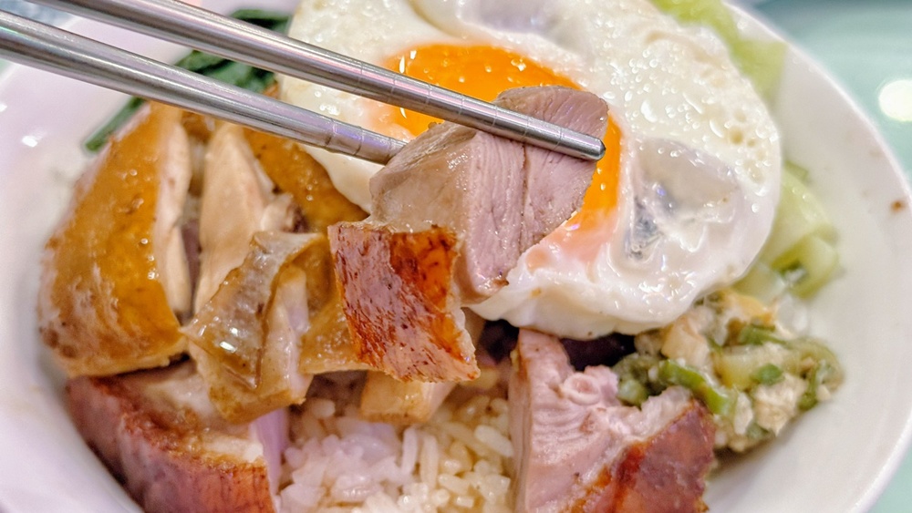 叉燒飯系列餐點的蛋都能夠選擇要半熟還是全熟。另外也還能加價更換成撈丁或是公仔麵以及蔥油轉XO醬。這天三寶飯的蛋,我們就是選擇半熟。