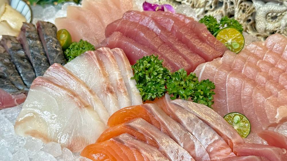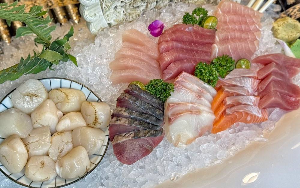 超澎派的刺身,內有像是鮭魚、鮪魚、旗魚、鯛魚、海鱺、鯖魚等,以及一盤干貝。