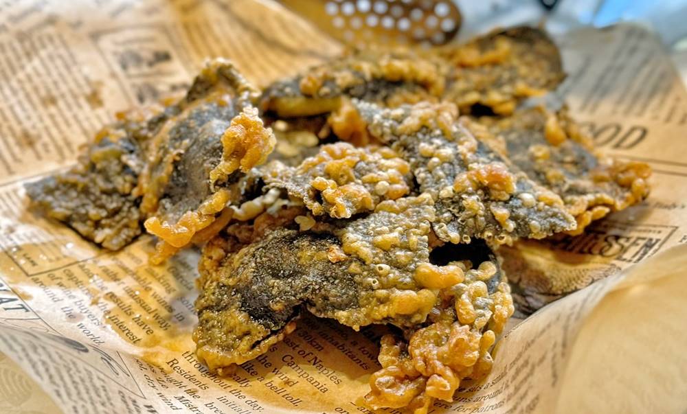 小孩愛吃超愛吃鮮蝦海苔揚,一口咬下直接能品嘗到海苔的酥脆以及包覆在內的蝦仁,真的很推!另外一旁的避風塘一口蟹則是深受大人的喜歡!
