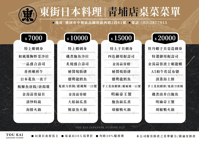 東街日本料理-青埔店的菜單基本上有分為小吃菜單、桌菜料理、合菜料理、隱藏料理等等,各店的菜單會有些微不同,詳情都可以到官網查詢或是去電詢問店家。