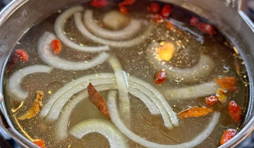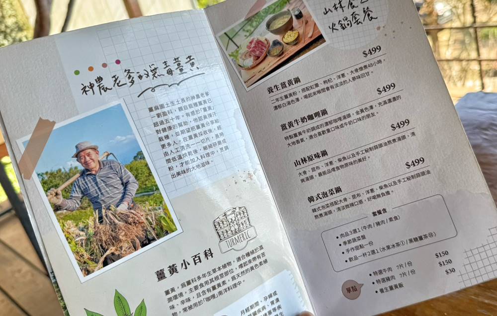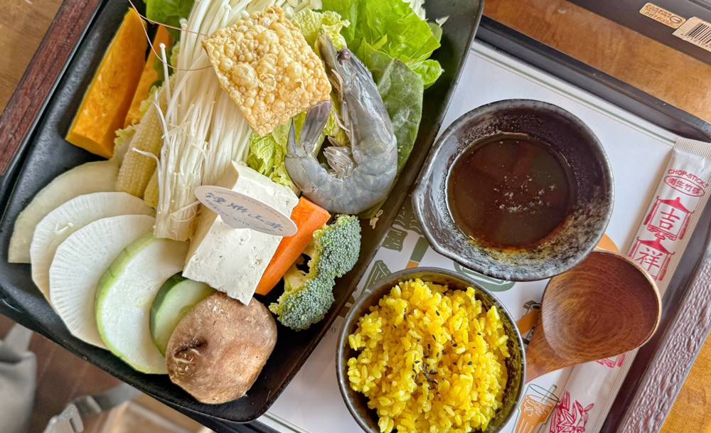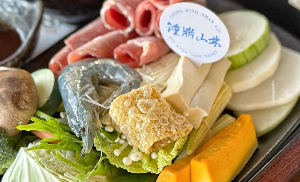 來到鍾鼎山林,當然不能錯過他們家的招牌–養生薑黃火鍋,所使用的薑黃可是店家親手種植,薑黃湯頭的風味帶點淡淡的咖哩味道,但整體的口感算是溫潤順口。當然鍋物搭配的季節蔬菜盤也就是大同小異,唯獨多了鍋物的牛肉片。
