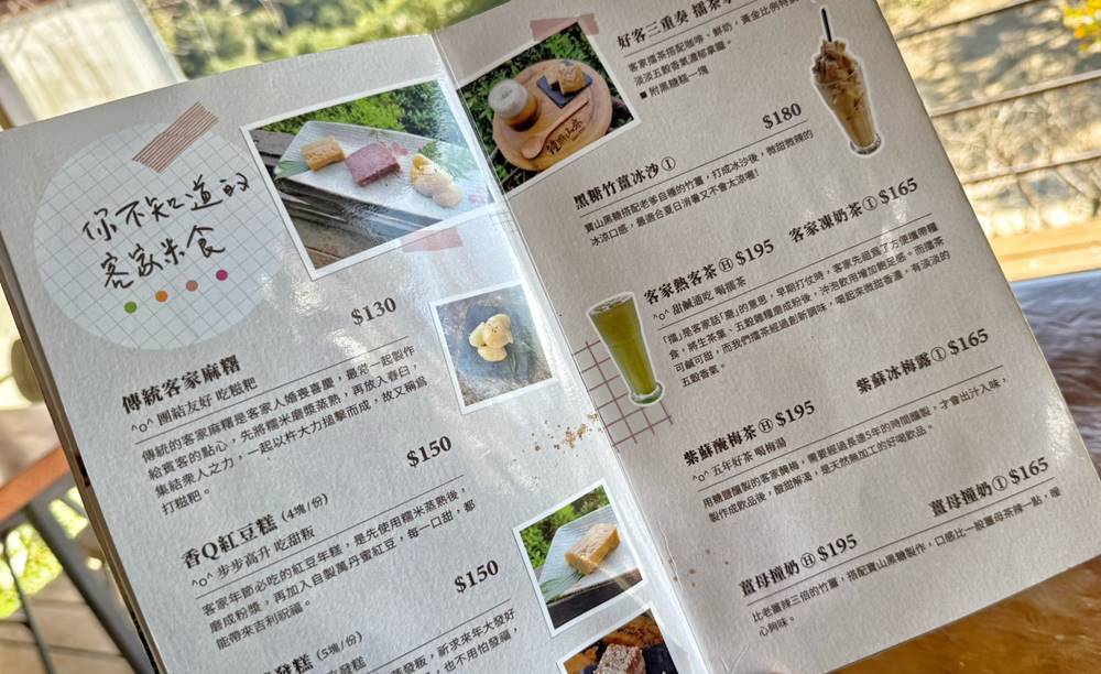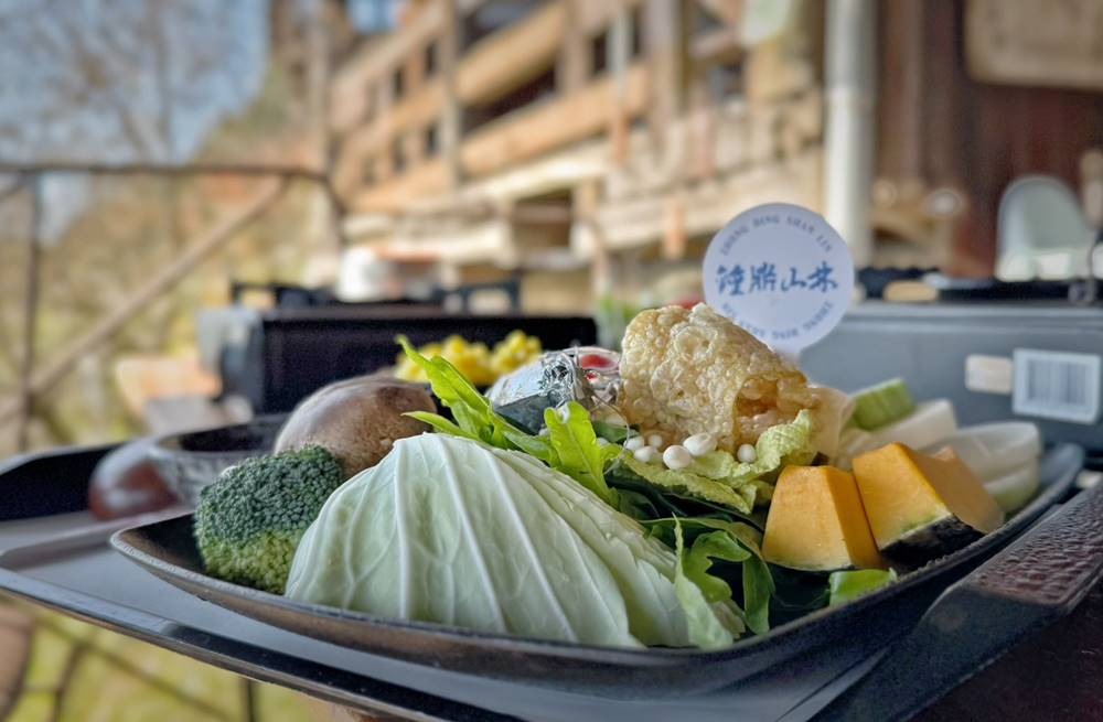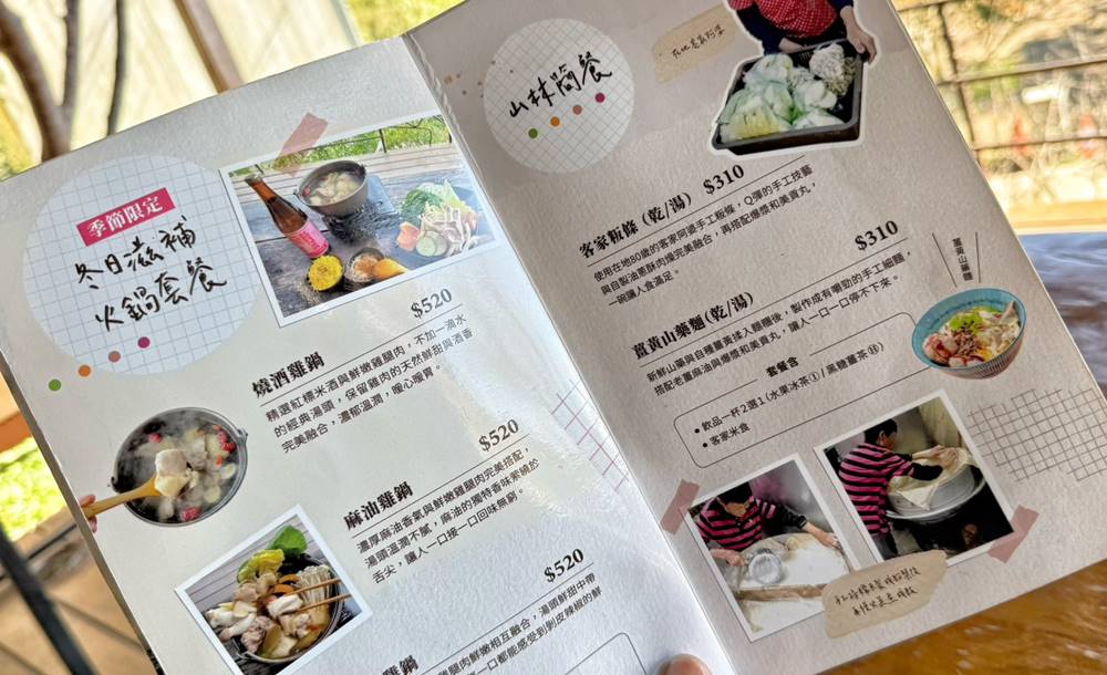鍾鼎山林提供的餐點有火鍋套餐、麵食套餐、特色飲品、客家米食、私房小點心等,而每人都基本低消為一杯飲品,園區內禁帶外食。點選餐點直接掃取桌上的QR-CODE,接著再到櫃台結帳即可,用餐時間沒有太多的限制,但只要用餐差不多,一離席他們就會很快速地來整理桌面等,畢竟假日要拚翻桌率。